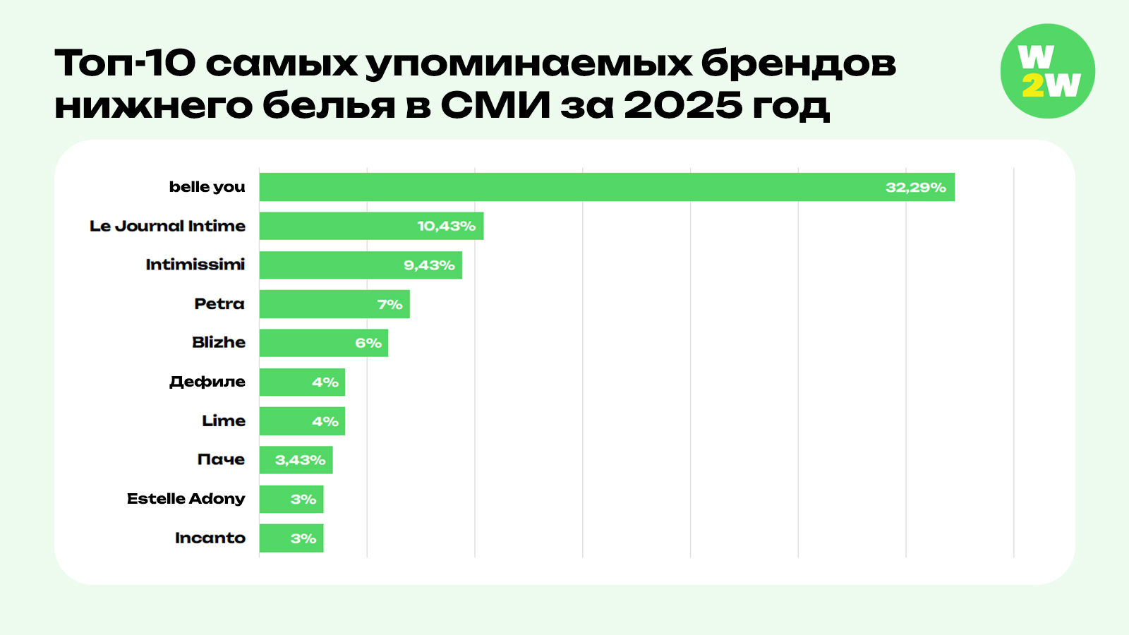Рейтинг упоминаемости брендов нижнего белья в СМИ составляется коммуникационным агентством Win2Win Communications с 2023 года. В этом году были проанализированы материалы порядка 300 онлайн-изданий, где отслеживалась упоминаемость более 60 российских и зарубежных марок.